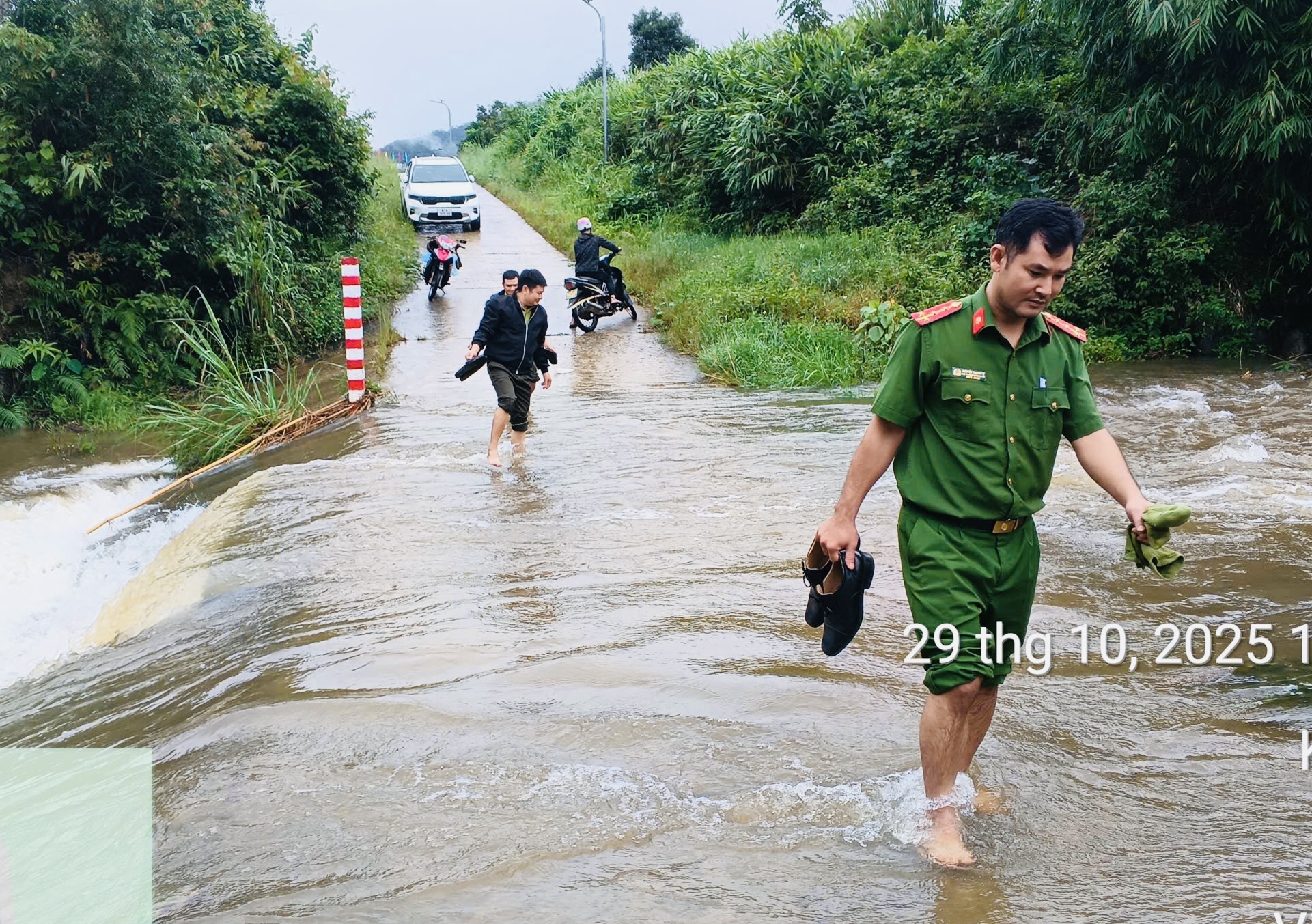 Trong quá trình kiểm tra, lực lượng Công an xã cùng các đơn vị liên quan đã chủ động nắm bắt tình hình, kịp thời cảnh báo người dân không qua lại những khu vực ngập sâu, có nguy cơ sạt lở, đồng thời hỗ trợ di chuyển và đảm bảo an toàn giao thông tại các điểm xung yếu.